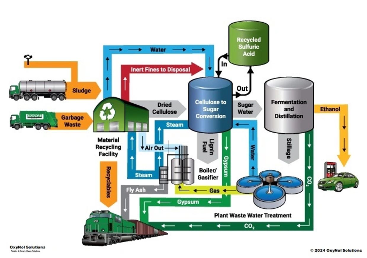 The CES OxyNol process involves five steps whereby the cellulose in municipal wastes, in the form of hydrocarbons, is converted into sugar (primarily glucose). The sugar is subsequently fermented into alcohol, which is denatured to produce fuel-grade ethanol.